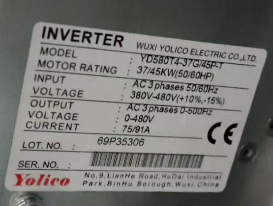 電機45KW,額定電流91A,額定轉速1480rpm,根據(jù)電機的型號,我司選擇了額定電流91A的型號為YD580T4-37G/45P-T變頻器