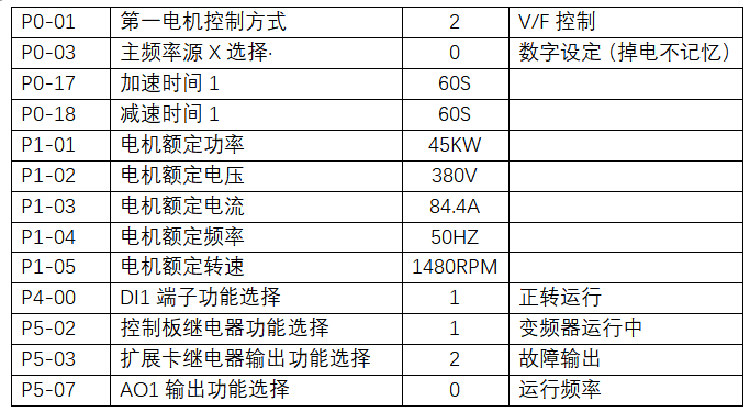 變頻器和電機之間存在一定距離,變頻器和電機都要做好接地的準備?,F(xiàn)場變頻器帶45KW電機,DI1給定端子啟動,AO1頻率輸出,一組繼電器TA1/TC1反饋運行信號,另一組TA2/TC2反饋報警信號。RST接電源,UVW接電機